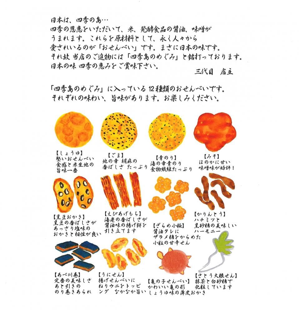 当店自慢のおせんべい、あられ、かわいい亀の子せん・亀戸大根せんべいの詰合せです。